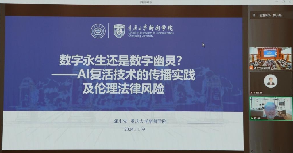 重庆大学新闻学院院长郭小安教授以“数字永生还是数字幽灵?——AI复活技术的运用实践及伦理法律风险”为题,展示了AI复活在情感补偿与情感抚慰、家国情怀与建构叙事、文化传承与知识科普,以及社会公益与温情传递等方面的传播实践和效能,但也指出其会带来生死决定权未知、对逝者家属衍生二次伤害,以及由此可能引发的法律风险等问题。郭小安教授表示“没有遗忘,何谈怀念;没有失去,何谈珍贵。”不能因AI技术存在风险而消极应对,而应将人类道德立足于机器道德之上,服务于全人类,为人类增添福祉。