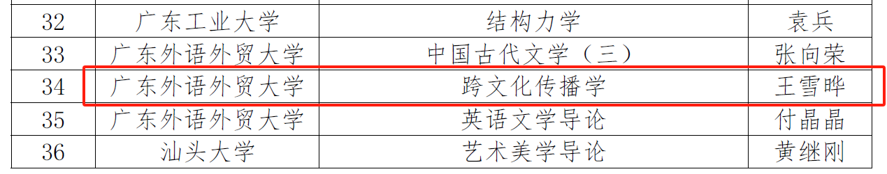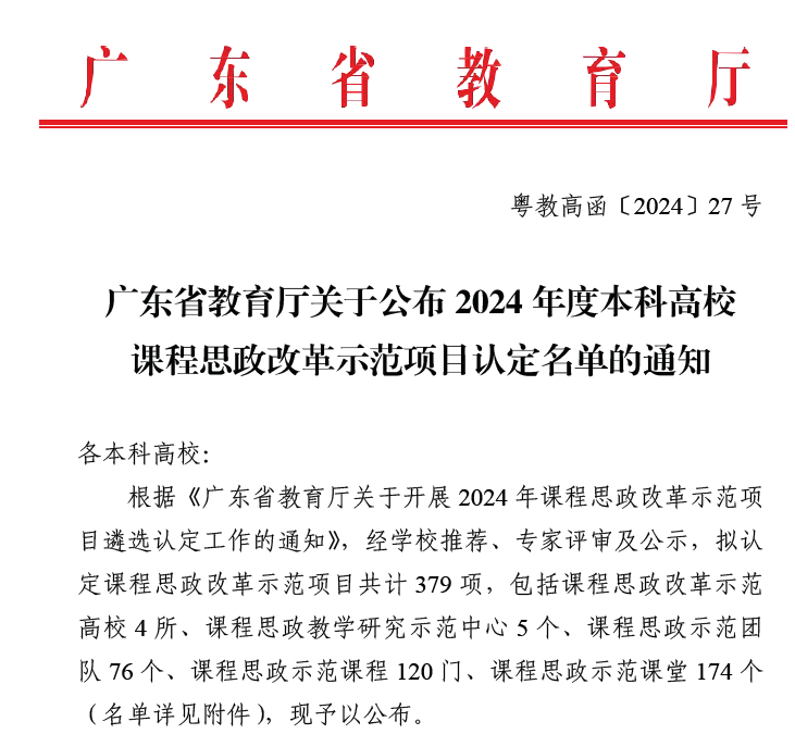 近日,广东省教育厅公布了2024年度本科高校课程思政改革示范项目认定名单,我院王雪晔老师申报课程《跨文化传播学》获批省级课程思政示范课程,同时被认定为省级一流本科课程。