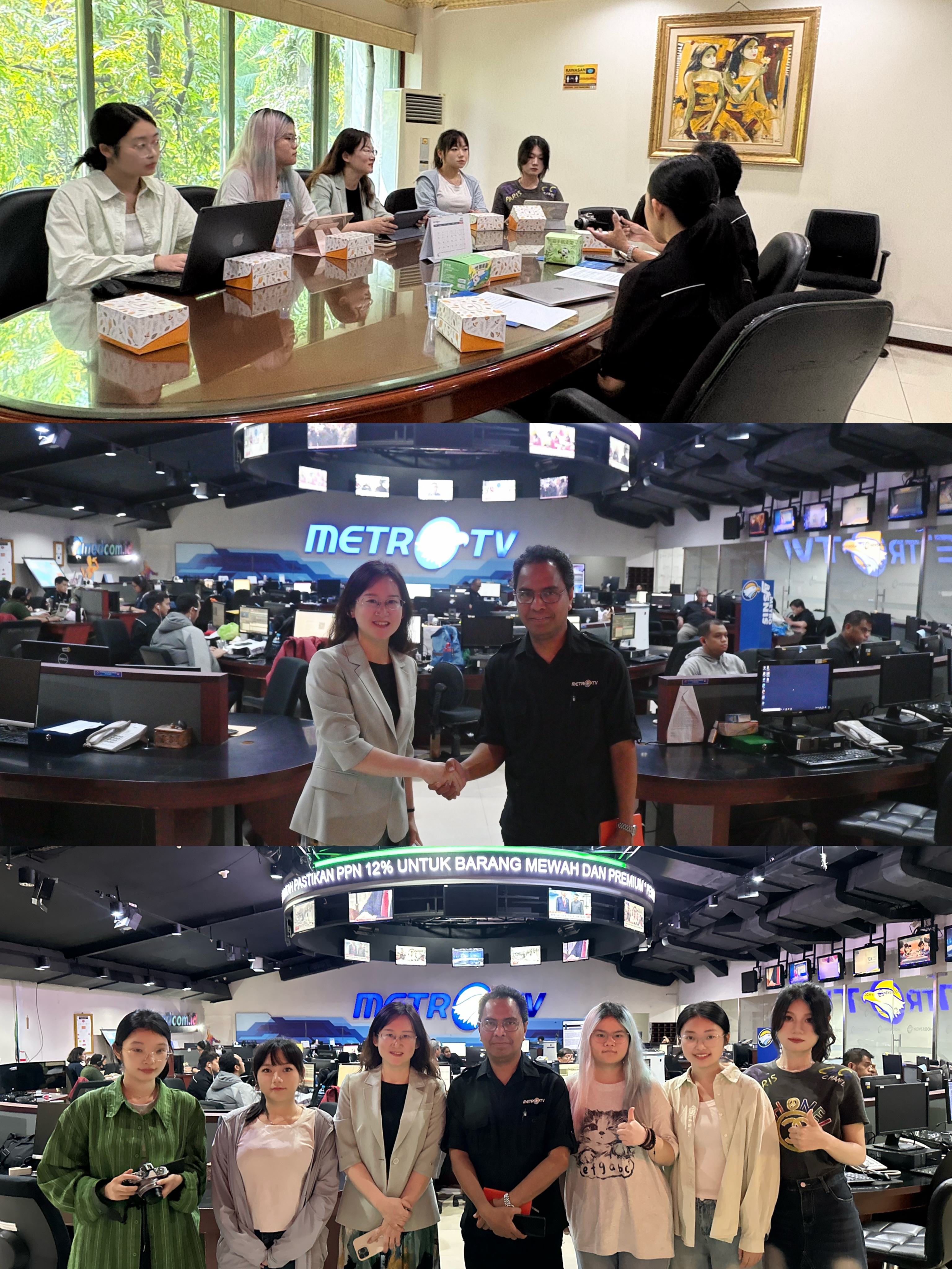 团队拜访印尼主流电视媒体美都电视台,与美都电视台新闻制作部负责人Yohanes S Siahainenia先生就雅万高铁的媒体报道及公众舆论展开讨论。美都电视台新闻制作部负责人表示,高铁项目吸引了印尼民众的广泛关注,如何在本地化叙事中平衡技术宣传与社会影响,是新闻报道的关键挑战之一。