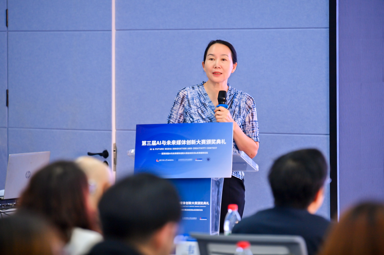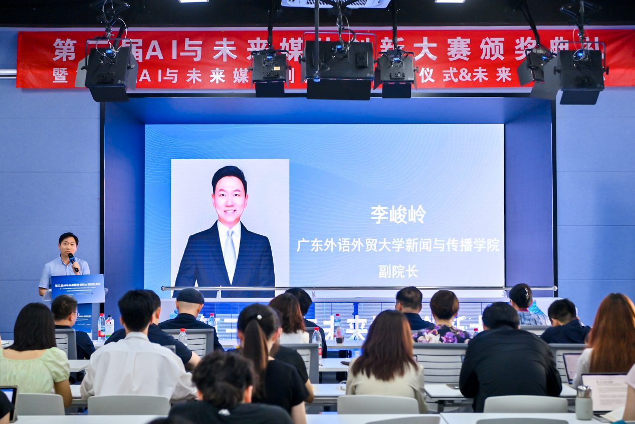 广东外语外贸大学新闻与传播学院副院长李峻岭在致辞中指出,进入终审的这些作品聚焦破解就业困境、守护国家安全、关注大学生心理健康、推动技术革新等社会命题,既是 AI 与未来媒体的技术变革,更是创新思维与技术实践的交响。他表示,第三届大赛见证无数创意种子破土,期待第四届AI与未来媒体创新大赛带来新想法、新理念。