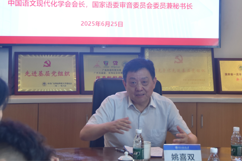2025年6月25日,中国传媒大学教授、博士生导师姚喜双教授到访广东外语外贸大学新闻学院,与学院教师围绕播音与主持艺术专业学科进行深入交流。机关党委组织员五级职员(主持新闻与传播学院党委工作)商杰强主持活动,新闻学院领导及教师代表参加座谈。