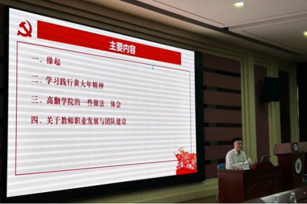 会议第一部分为第四批“全国高校黄大年式教师团队”——广外翻译教师团队代表作专题分享。广东外语外贸大学高翻学院党委书记李和民从“缘起”、“学习践行黄大年精神”、“高翻学院的做法与体会”、“关于教师职业发展与团队建设”四个方面展开分享,他强调要通过“有组织的科研”实现合作共济,学院也需要给予支持,营造良好氛围助力教师成长与团队建设。