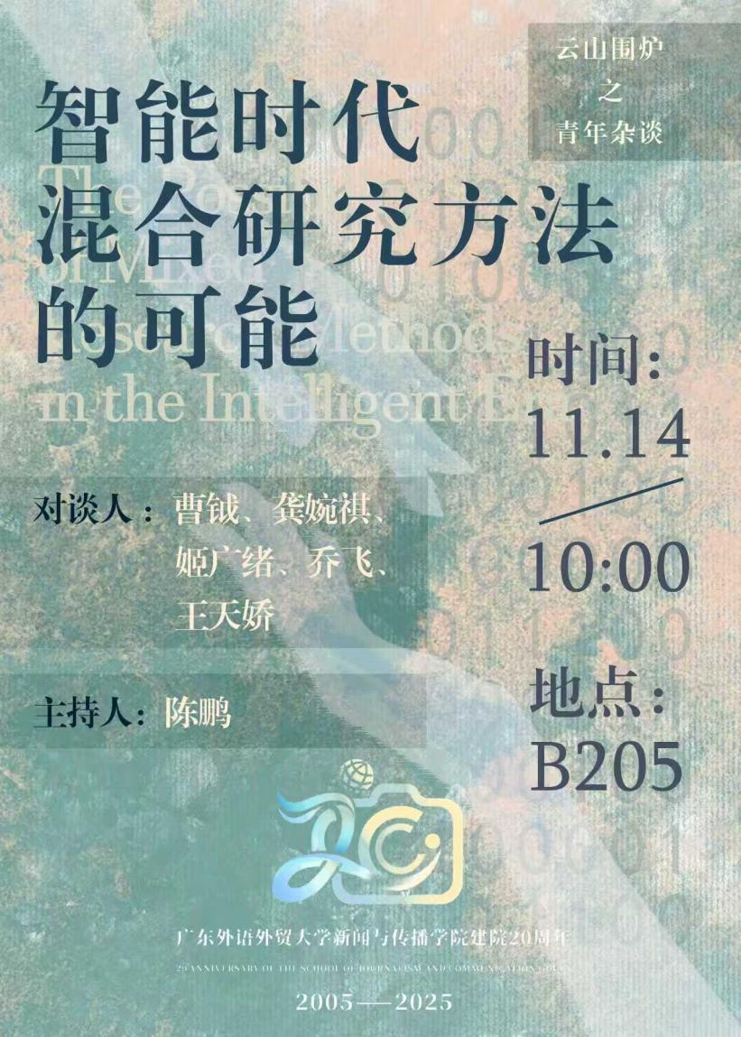 近日,值广东外语外贸大学新闻与传播学院建院20周年之际,“云山围炉”系列学术对话论坛首讲在大学城校区博学楼B205的“智憩坊”研休空间正式启幕。对谈以“智能时代:混合研究方法的可能”为主题,学院教师曹钺、陈鹏、龚婉祺、姬广绪、乔飞、王天娇“围炉”畅谈,共同探讨智能技术对研究方法的影响。20余名研究生参加了论坛。