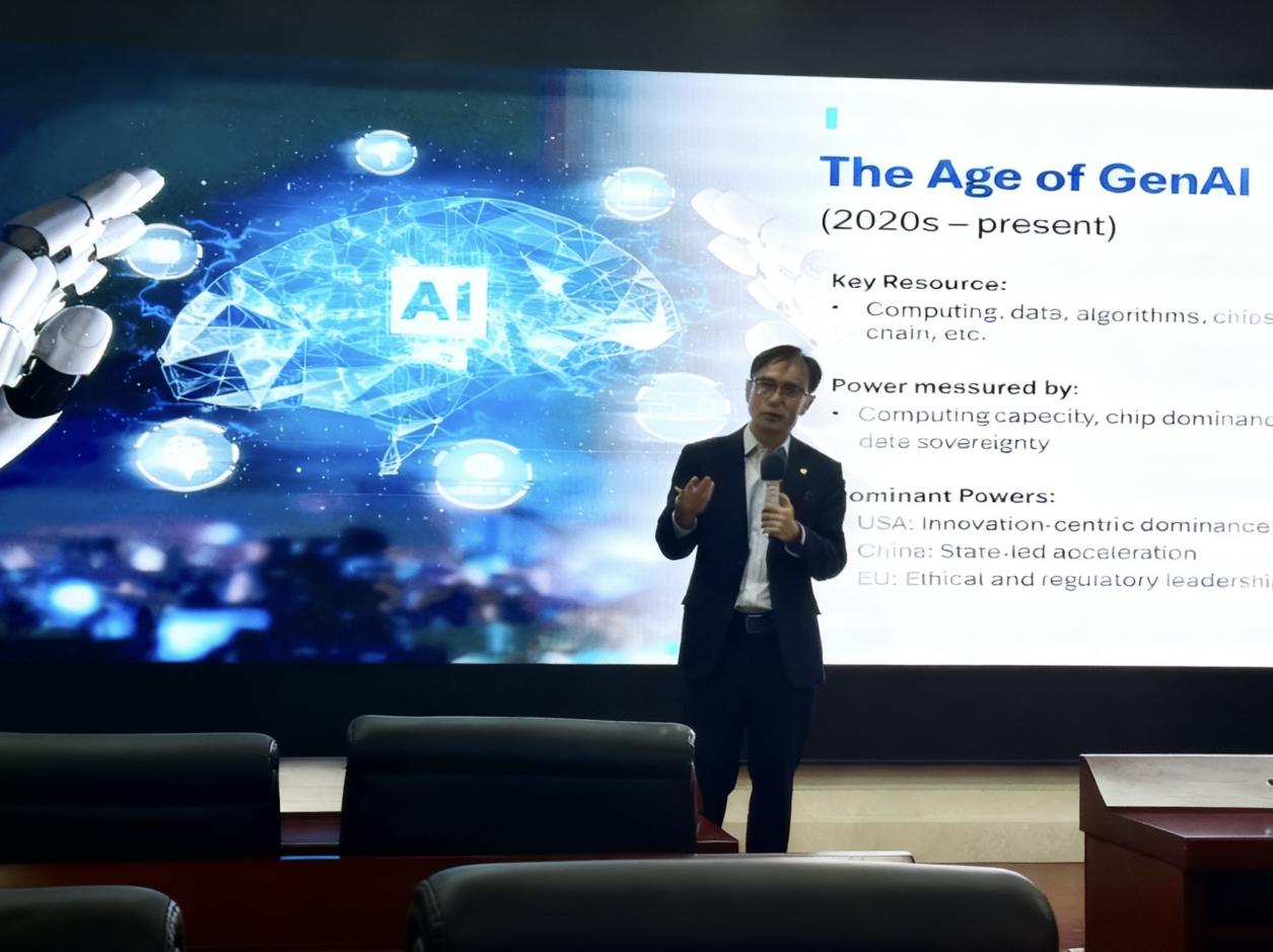 11月14日,香港浸会大学传理学院院长锺布教授以《AI与全球数字新秩序:重构国力、传播与国际影响》为题,结合前沿研究项目与全球数据,为学院师生解析AI对社会发展与国际格局的重塑作用。