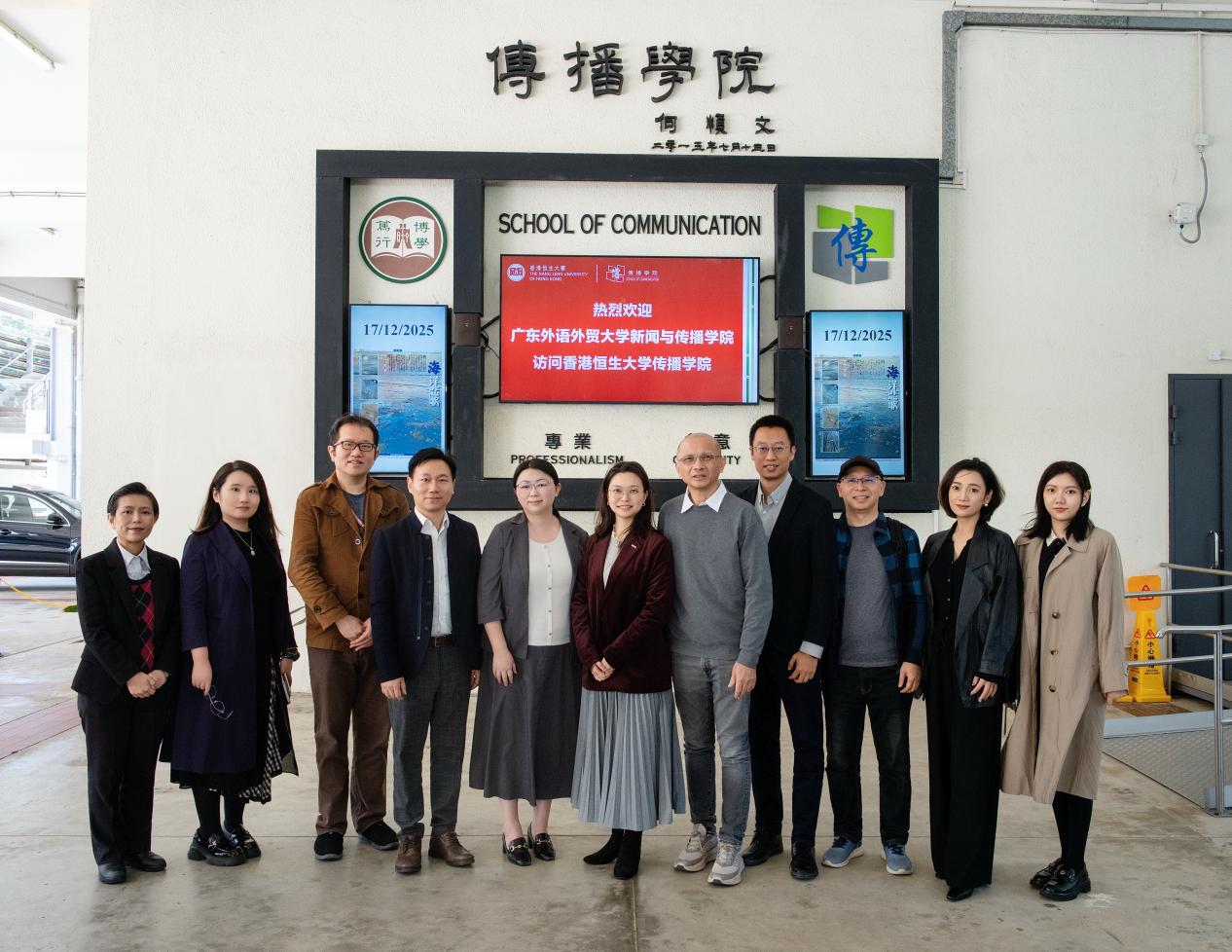 2025年12月中下旬,广东外语外贸大学新闻与传播学院教师团队一行赴香港高校及媒体展开学术访问交流。此次访问交流以粤港澳大湾区高等教育协同发展为契机,旨在创新传媒人才国际化培养路径,深化与香港高校、媒体的各项合作计划,同时也为即将开展的2025年广外新闻学院“智汇湾”粤港澳大湾区研究生协同创新工作坊项目具体磋商对接工作。新闻学院副院长朱颖教授、副院长李峻岭教授、新闻系主任陆扶民教授、网络与新媒体系主任陈鹏副教授、何钢博士、黄琦翔博士、魏飞菲博士、尹子伊博士全程参加了此次访问。