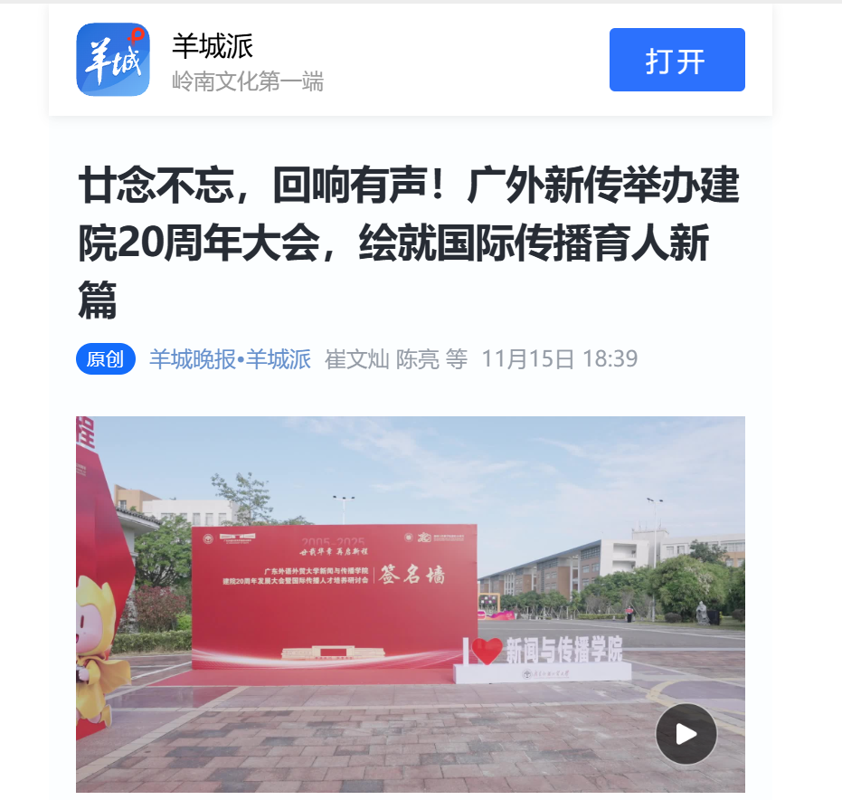 推动双庆同频共振,双向赋能共谱新篇。学院成功举办建院20周年发展大会暨国际传播人才培养研讨会,邀请42所省内外兄弟院校、14家媒体单位及6个地方校友会代表共襄盛举,400余名校友重返母校,直播观看突破5000人次。庆典大会庄重热烈、校友联络温情高效。学院出版《廿年同行 共谱华章——广东外语外贸大学新闻与传播学院校友风采录》,全方位展现育人成果与校友风采,发布《回响有声 廿念不忘》建院20周年专题宣传片,引发广大师生校友广泛共鸣。《中国社会科学报》整版报道学校和学院国际化传播人才培养成果,进一步提升社会影响力。