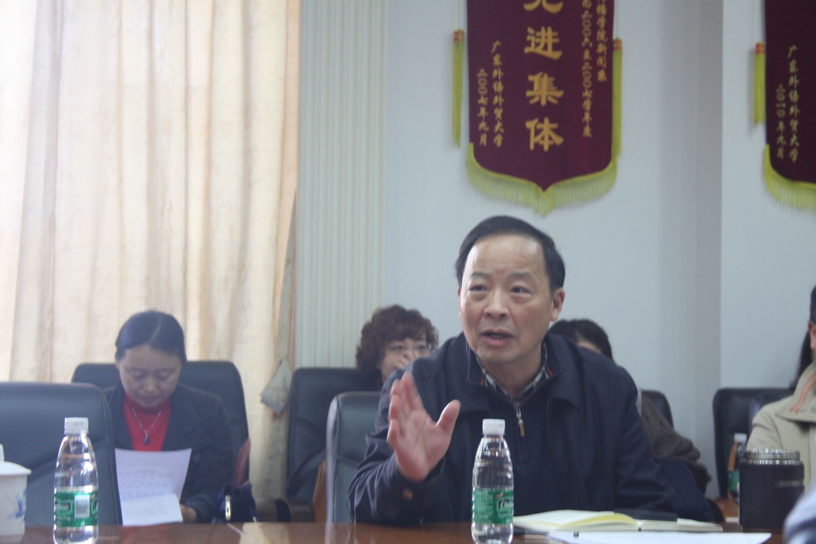 郭光华代表老班子首先表达了对全体同事的感谢,并指出,学院从弱小逐渐发展壮大,这凝聚了全体老师的心血,2014年硕士点申报成功是重大突破。2015年将迎来建院十周年院庆,应该充分利用这个契机总结提炼梳理学院这十年的发展历程与宝贵经验。他尤其感谢以於贤德、高红艳、陈国昌、李砾、侯琰慧等为代表的教师对学院发展做出的贡献,相信我院明天会更美好。随后,刘超也总结了自己管理教学这五年的心得,与大家分享了自己的酸甜苦辣和对未来的愿景,同时表示会继续发挥自己微薄的力量为学院的发展而努力。