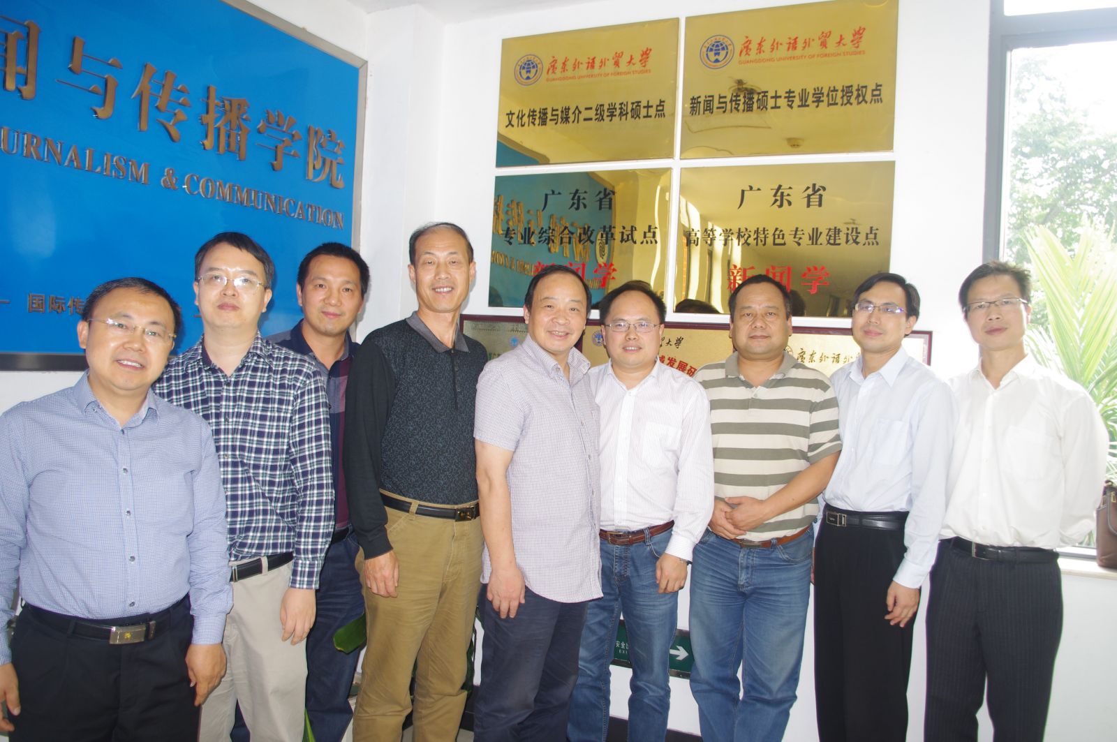 孔晓明先对到访我院的教授们表示热烈欢迎,然后介绍了我院发展概况与成就,并提出将向川外学习,开办网络与新媒体专业。刘超重点介绍了我院全英与双语教学情况,以及我院对提高师资力量和发挥学生英语优势的重视。侯迎忠以11年“乌坎事件”等具体事例介绍了我院在新闻发布效果评估及舆情监测上的成果。