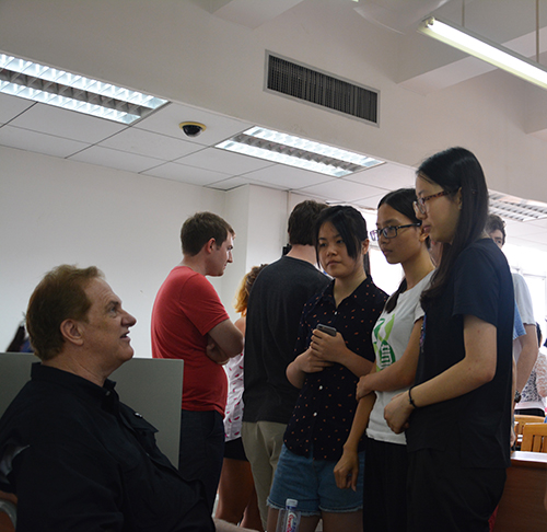 早上九点不到,F508教室便坐满了参与课程的学生,当中还有个别对课题感兴趣的14级同学。Jim Ebel教授在座位前后走动,调动着在座学生的积极性。“你能坐到这位女生旁边吗?”教授示意着广告班蔡同学坐到外国女生Robyn旁边,“她(指Robyn)一直想认识个中国男生,你是男生吧?又是中国人吧?两个标准都符合,所以你就是坐在这里的合适人选了!”在同学善意的哄笑声中,蔡同学大方地坐下,和Robyn交流了起来。