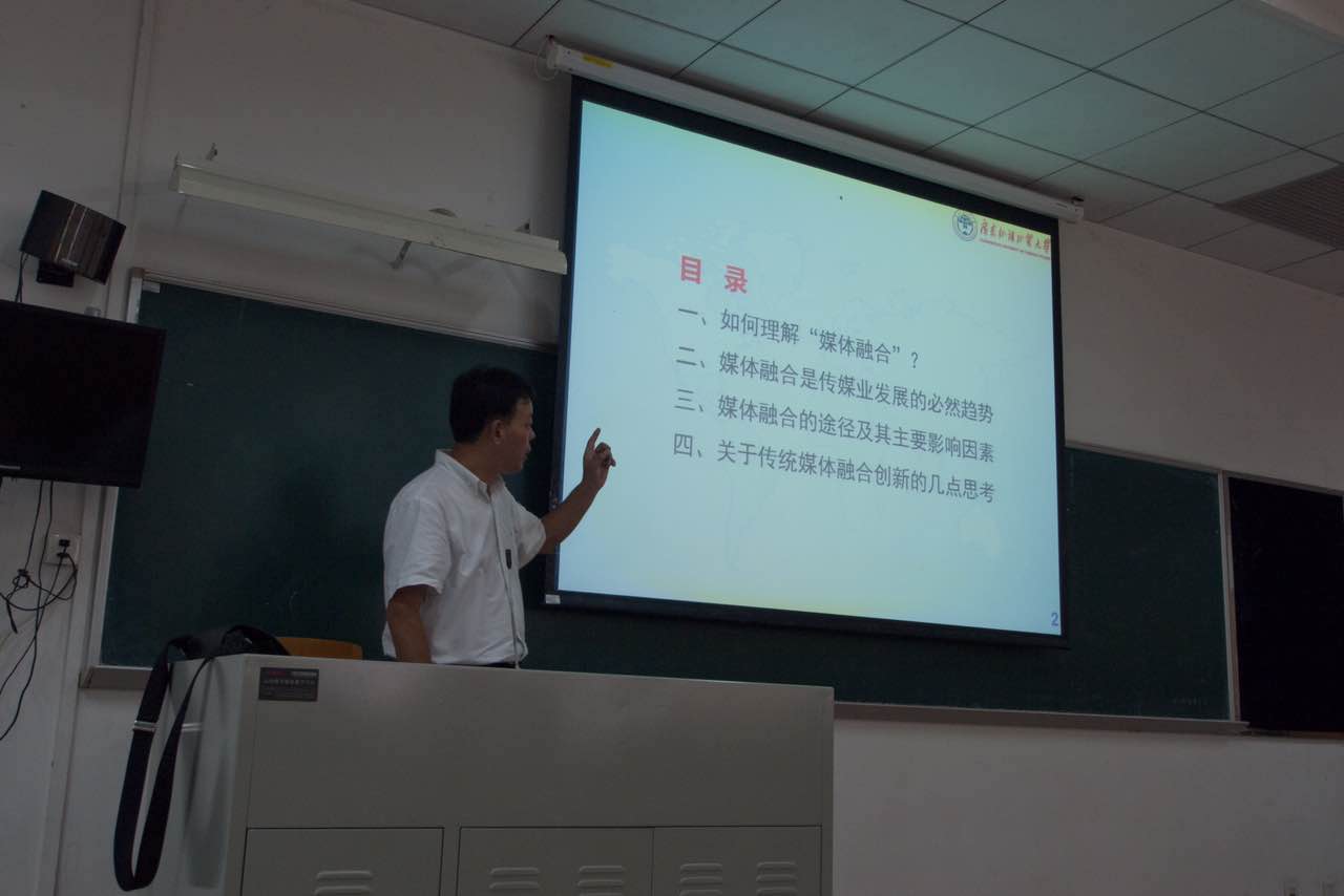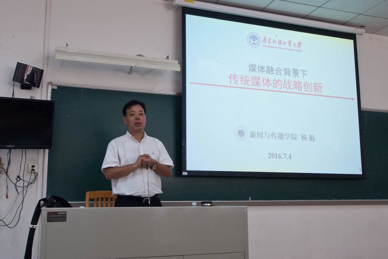 7月4号上午,广东外语外贸大学院长杨魁教授为校2016年全媒体与国际传播研究生暑期学校暨研究生学术论坛进行了第一讲,此次讲座的主题是“媒体融合背景下传统媒体的战略创新”。世界潮流,浩浩汤汤,顺之者昌,逆之者亡。媒体融合如何摆脱现有体制的束缚,实现体制机制的创新,是杨魁教授带领大家探讨的主要问题。