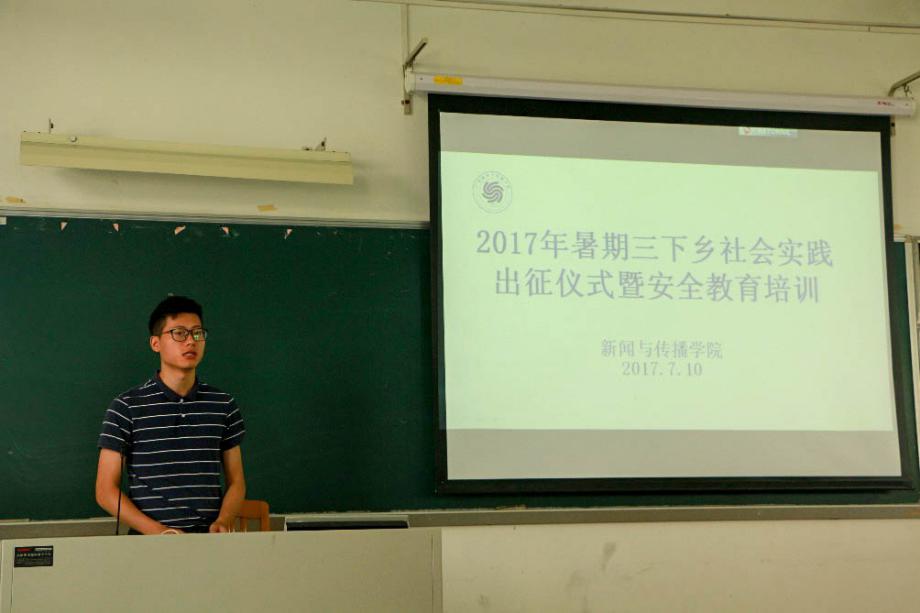 本次活动分为多个环节,首先是各队队长及其下属组长分别上台献言,对整体任务安排作简单介绍。随后黄石胜发表了讲话,他对队员们就活动的进程开展与实践成果提出了要求,希望队员们能发挥新闻学院学生的自身优势,设身处地、竭尽所能地为三下乡合作方排忧解难、建言献策,让下乡成果飘香,使合作土壤永固。在此之后,便是本次会议的重点——“人身安全与自我保护”的培训。陈博菲在会上多次强调,无论活动进展如何、成果如何,安全永远要摆在实践工作的首位。他列举出活动中可能出现的意外情况并提出了相应的解决方案,在提高队员安全意识的同时也给予队员们贴心提醒。