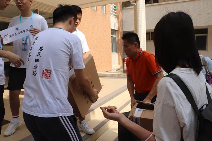 向导组志愿者身穿蓝色马甲,站在车站、风采园路口、中行路口等地方指引着新生。作为向导组的组长,丘广桦认为虽然工作很忙、天气很热,但见到新生们依然难掩兴奋。她说:“(见到他们)就像见到一年前刚步入大学校园的自己,很想为他们解决疑难。”而在北苑5栋、6栋和南苑7栋楼下,人力资源组的志愿者也同样等待着,为新生们搬运沉重的行李。作为组长之一,叶德尔表示看到新生们很开心,他说:“看到面带期待的新生们,帮他们搬行李也很有干劲。”