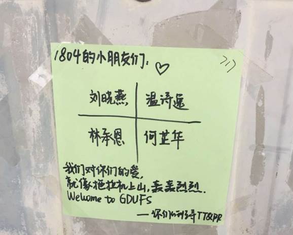 各班班导们也做了很多的准备工作,五栋三楼的新生宿舍门前,1801的班导周泽双、柳宵与1804的班导郑文意、阿力米热给每一个宿舍都贴上了小纸片,上面写了宿舍四人的名字以及新生寄语。通过小小的细节,让新生感到温暖。