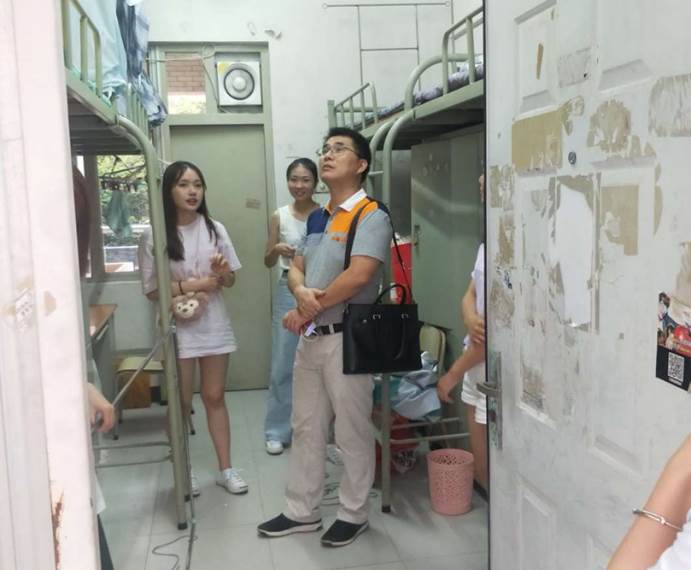 下午6点,党委副书记黄石胜、新生辅导员刘坤辉与班导一同走访新生宿舍,向学生表示慰问和关心,与新生热情交流,认真倾听学生的需求。