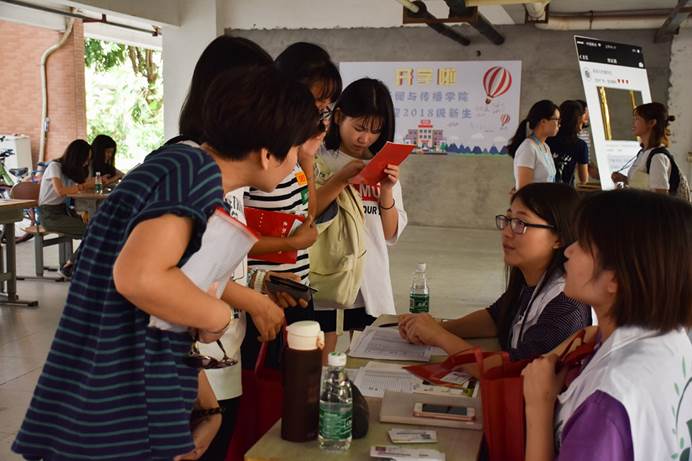 本网讯 9月9日,是广东外语外贸大学2018级本科新生的正式报到日。新闻学院即将迎接251名新生,其中152名是00后。自清晨起,新闻与传播学院的新生和家长们陆续地走入了广外校园。新生们根据指示牌的指引,在志愿者的带领下,顺利地领取到宿舍钥匙,并在学院报到点六栋架空层下,扫描录取通知书进行注册、领取校园卡、新生手册等新生资料,有序、快速的完成一站式便捷的新生报道流程。