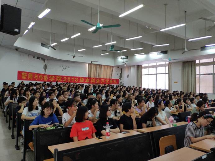 本网讯 9月11日上午九时,新闻与传播学院2018级本科学生开学典礼于南校区教学楼F315正式举行。出席本次开学典礼的有新闻与传播学院院长杨魁、党委书记黄秀娟、副院长何国平、新闻系主任朱颖、广告系主任李淑芳、播音与主持艺术系主任李峻岭、学院办公室主任吴胜、团委书记陈博菲、辅导员张维、18级辅导员刘坤辉以及部分教师代表、2018级全体新生及第四届朋辈导师。典礼由党委副书记黄石胜主持。