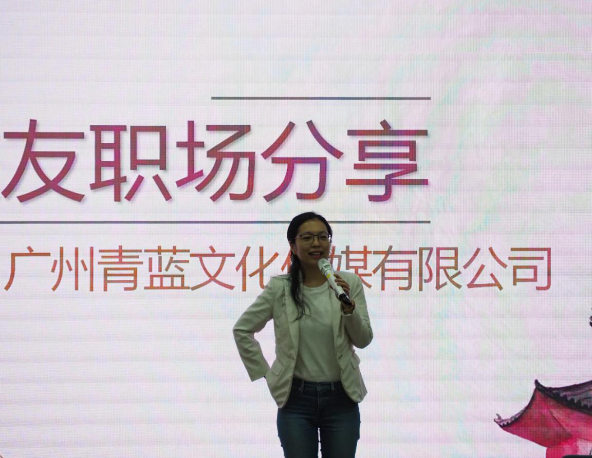 校友李慧妍介绍了创办广州青蓝文化传媒公司的创业经历,分享了创业的艰辛和乐趣,指出作为一个成功的创业者,视野不能局限于个人工作以及个人发展,更重要的是对于整个市场的把控以及对于公司成员凝聚力的维系。
