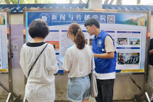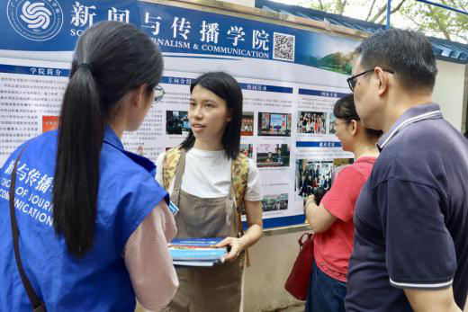 我院院长侯迎忠、党委书记郝建萍、副院长朱颖、副院长罗坤瑾、副书记黄石胜、新闻系主任唐佳梅、广告系主任龚婉祺、播音与主持艺术系主任李峻岭、网络与新媒体系主任姜熙等领导和学院办公室、辅导员、团学干部、朋辈导师等参加招生宣传活动,热情接待考生和家长咨询。