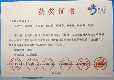王明哲同学介绍说,其获奖项目的孵化最初源于我院首届“讲好广东故事”新闻调查大赛,在学院配备的院内、院外双导师的指导下,项目组开展多项调研活动,形成了新闻稿、记录视频和调查报告多方面的初始资料,相关调研成果报道发表在《清远日报》、腾讯视频及广东省扶贫信息网等媒体。以这些成果为基础,先后获得“挑战杯”校赛特等奖、省赛一等奖。
