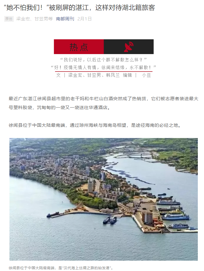 新闻学院16级“准”校友梁金宏,作为《南都周刊》实习记者参与采写“抗疫情”报道《“她不怕我们!”被刷屏的湛江,这样对待湖北籍旅客》并刊发。