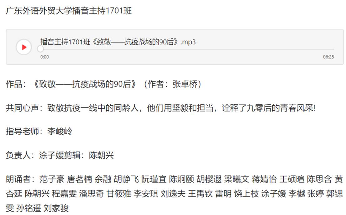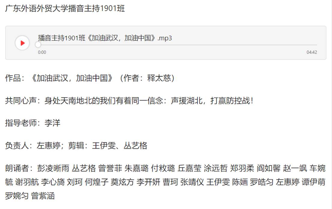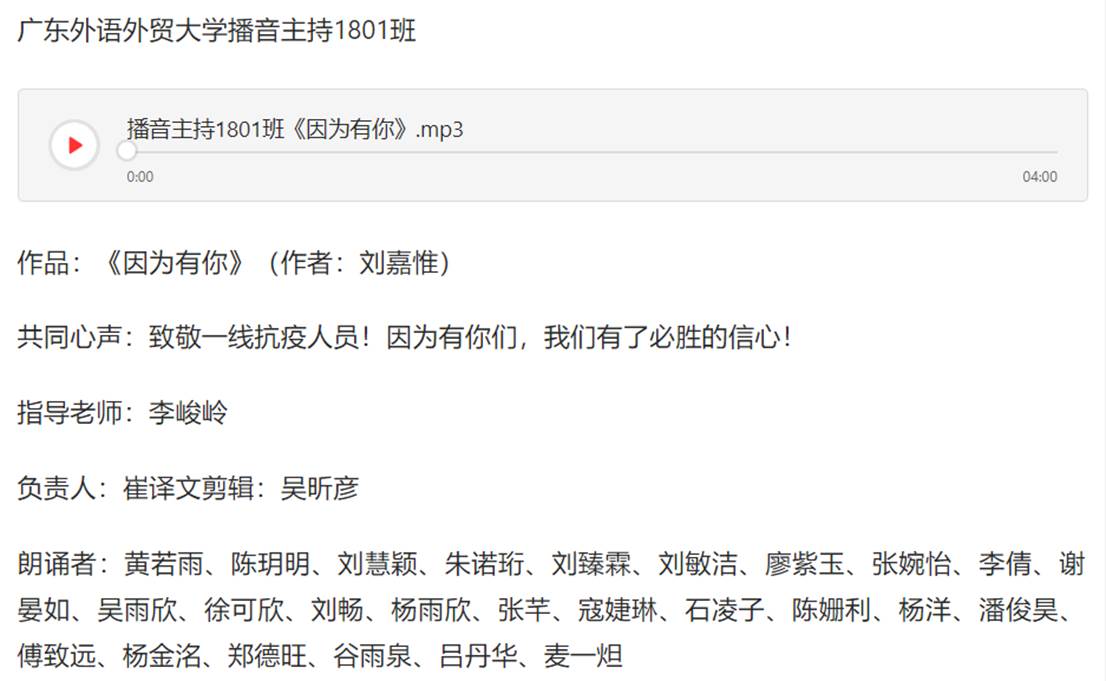 经审听及筛选后,广东外语外贸大学播音与主持艺术专业17级、18级、19级的同学们录制的三篇朗诵作品成功入选。此次三个年级所选的抗疫诗文,着重考虑了疫情带来危害后人们的积极反应,彼此的互相帮助,医护人员的舍身忘我。三篇作品均传递着温暖的大爱精神。