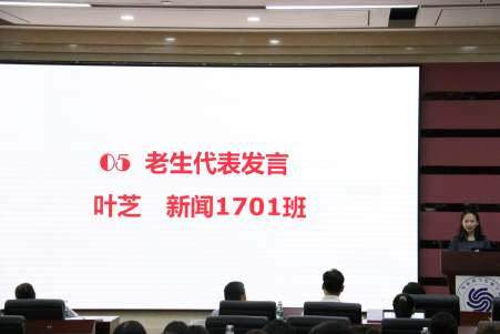 新闻1701班叶芝发言。她向师弟师妹们分享了入学三年以来的感受。她说到,新闻与传播学院是一个大家庭,是空间共同体、情感共同体也是发展共同体,希望师弟师妹们尽早在这里找到存在感、归属感、幸福感,融入新传大家庭。