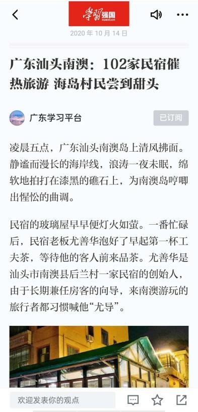 其中第十组采访写作的报道《102家民宿催热旅游 海岛村民尝到甜头》,首发于汕头+,随后橄榄台APP,大华网等媒体平台和“广东学习平台”全文转载,并被收录于“走向我们的小康生活”专题栏目中,引发广泛关注,截至2020年10月16日11:00,该报道阅读量总计突破810万,点赞量超24万。
