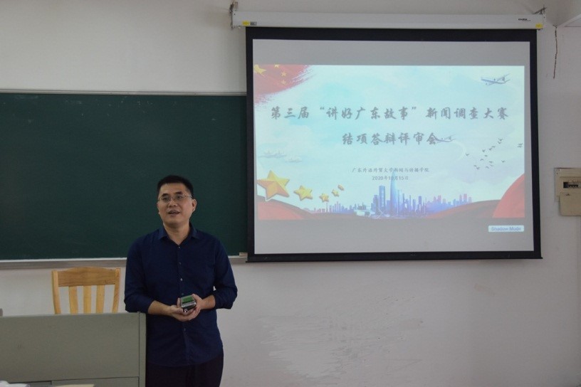 本网讯 10月15日,新闻与传播学院第三届“讲好广东故事”调查大赛结项答辩评审暨颁奖仪式在南校区教学楼B207举行,广州大学新闻与传播学院院长田秋生教授、暨南大学新闻与传播学院博士生导师赵建国教授、华南农业大学艺术学院传媒系主任李俊良教授担任答辩评委,我院党委书记郝建萍,副院长朱颖、副书记黄石胜出席活动。