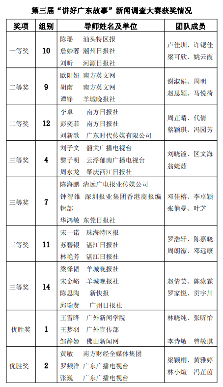 附录:第三届“讲好广东故事”新闻调查大赛获奖名单