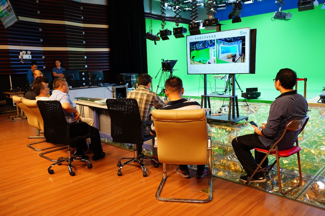 本网讯 11月18日,我院虚拟仿真演播实验室顺利通过验收,正式投入使用。这标志着我院融媒体与国际传播实验教学中心的建设又迈上了一个新台阶。我校资产处副处长李巨民、网络与信息化中心副主任陈平仲,我院院长侯迎忠、办公室主任吴胜、全媒体创新实验中心主任何钢参加了本次验收。
