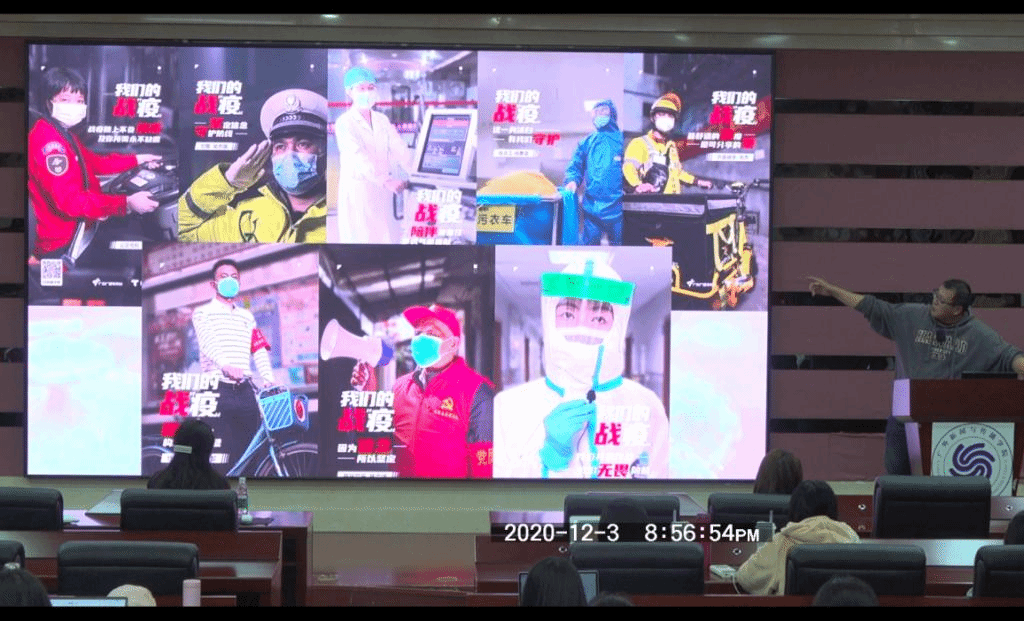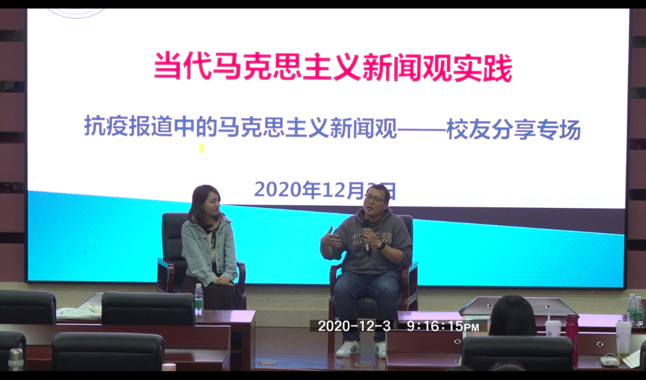 崔慧莹师姐思路清晰,寓情于理,从一线记者的视角出发,基于疫情发展动向与“从华南海鲜市场到新发地”的时空线索,通过介绍奔赴疫情前线的经历和细节,展示了新闻工作者的使命和责任;张巍师兄幽默风趣,语言活泼,向同学们再现自身对抗疫人物报道事迹素材挖掘与编写的全程,深刻展示了一位新闻记者对于“做有温度的报道”的理想追求。