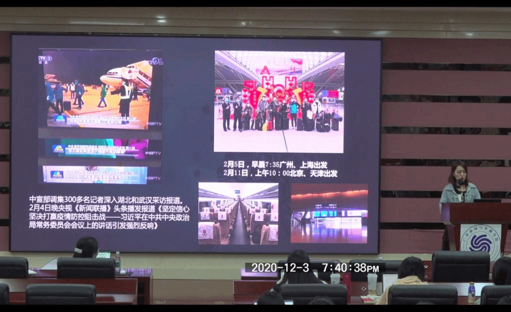 在下半场分享环节中,张巍师兄先以幽默诙谐的提问引出全民战疫的主题,进而介绍在本次抗疫中的优秀先进人物案例,通过策划背景,选题构思,三个坐标以及呈现效果四个方面层层深入,讲述了优秀人物事迹素材的挖掘与呈现,给同学们带来深刻的启发。
