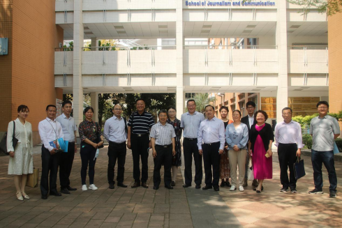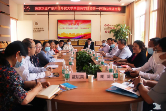 本网讯4月7日上午,广东外语外贸大学南国商学院董事长丁小军、督学顾也力、副校长赵福春等一行来我院交流。座谈会在教学楼B403会议室举行,我院党委书记郝建萍、院长侯迎忠、副院长朱颖、副院长罗坤瑾、全媒体创新实验中心主任何钢等相关人员出席本次座谈会。
