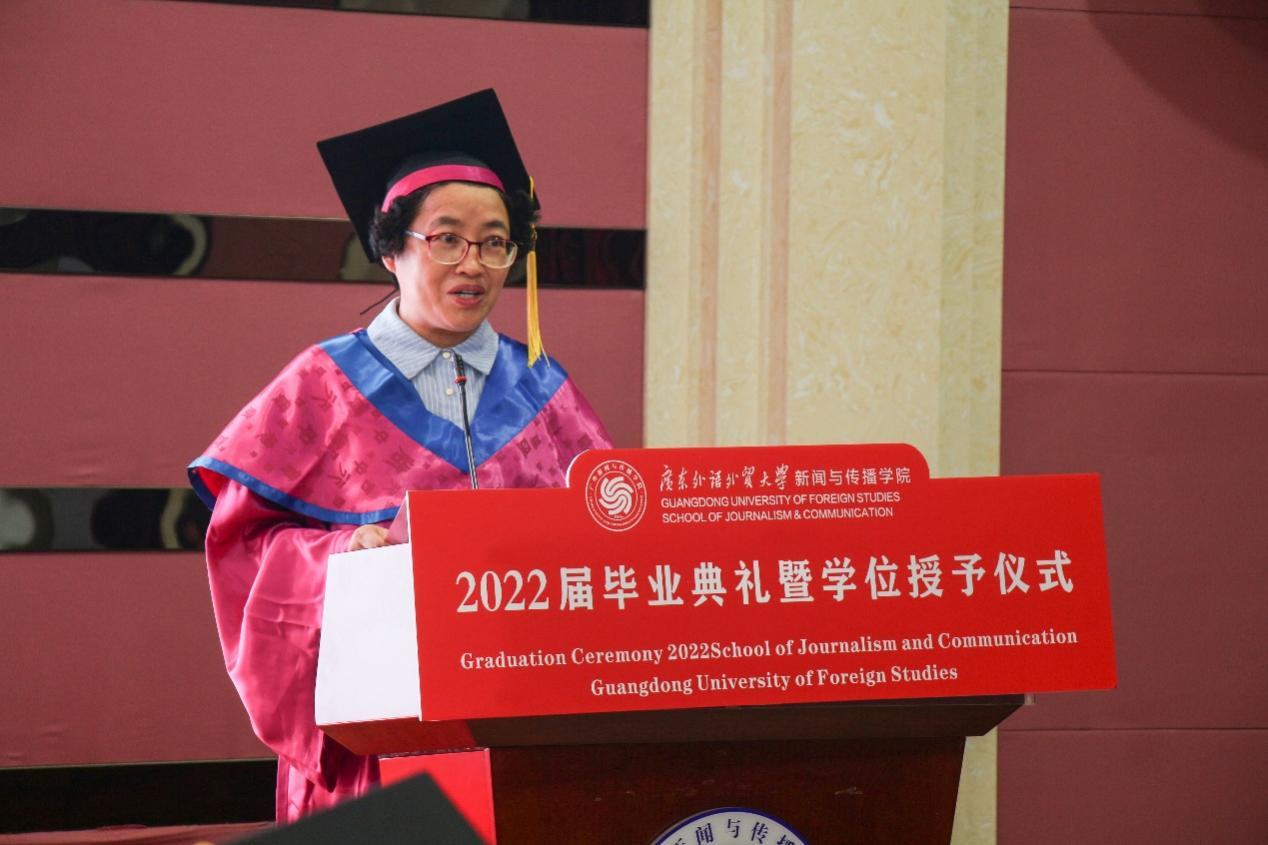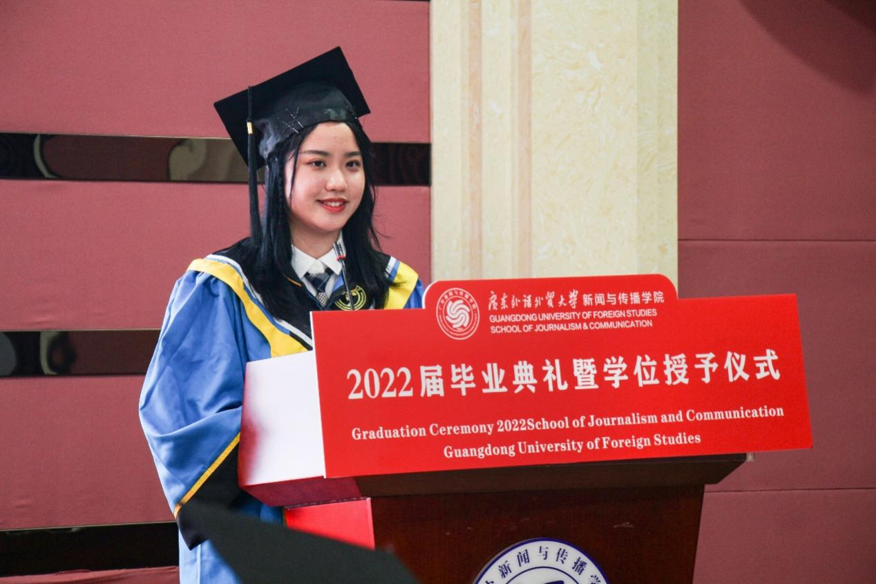 毕业生代表、优秀学士徐睿代表毕业生发言,她代表全体毕业生对领导、老师、同学,父母家人致以诚挚的感谢。她回顾了四年来从入学到毕业以来在广外新闻学院的的美好记忆,“我们为pre熬过夜,为大作业秃过头。通过模拟新闻发布会,我们努力去触及最真实的新闻现场”。她希望大家能够保持独立,保留人文关怀的赤子之心,不忽略那些需要爱和关怀的角落,谨记新闻人的责任与使命,为“让无力者有力,让悲观者前行”的目标而奋斗。