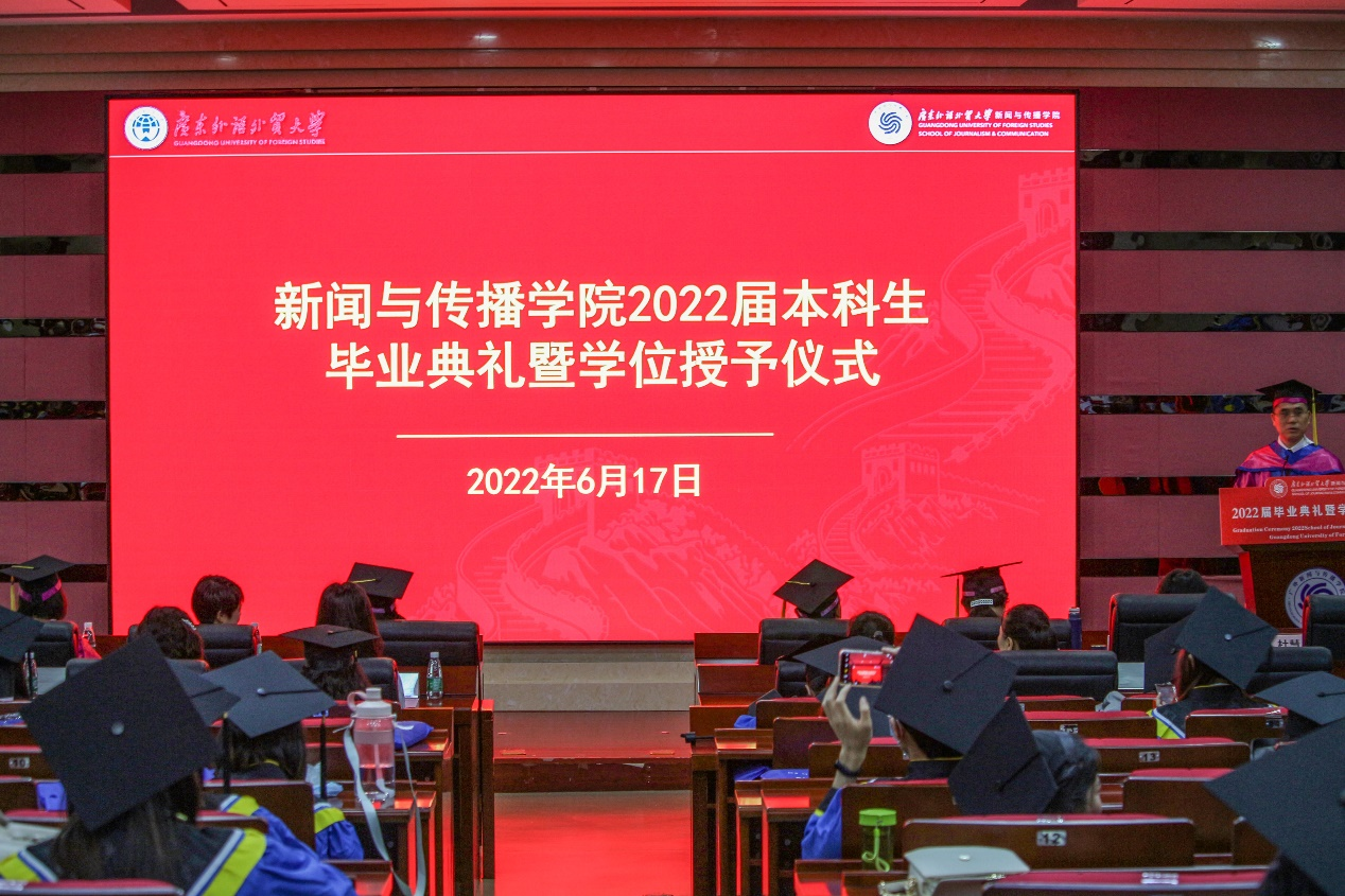 毕业生身穿学士服、头戴学士帽,在这里完成了他们在广外新传的最后一课。在奏唱国歌、毕业生宣誓、优秀学士颁奖后,在庄严厚重的礼仪乐中,学位授予仪式正式开始,130名毕业生依次走上台,导师们为他们一一拨穗、颁发学位证书、合影留念,寄予对毕业生未来之路的浓浓祝福。