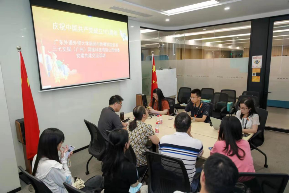 为庆祝中国共产党成立101周年,加强基层党组织建设,7月1日下午,在新闻学院党委书记郝建萍的带领下,学院党委副书记黄石胜、组织员陈博菲、团委书记张维、辅导员刘坤辉、周明、潘敏等一行前往三七互娱(广州)网络科技有限公司党委开展党建共建交流活动。双方在会议室开展了座谈交流会,三七互娱集团党委副书记、品牌总监孙宇星、品牌专家吕燕青、品牌主管赵琦雯、品牌专员陈敏静等人员参加了会议。双方就开展党建共建、产教融合、实习就业、社会实践等项目进行深入交流和研讨。