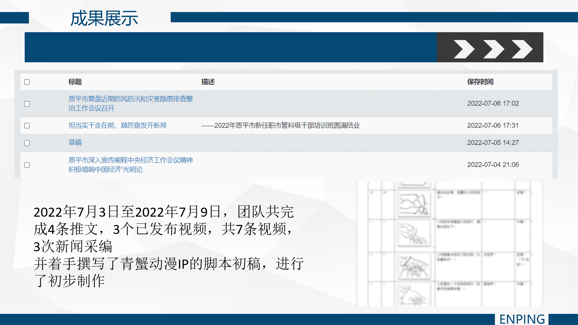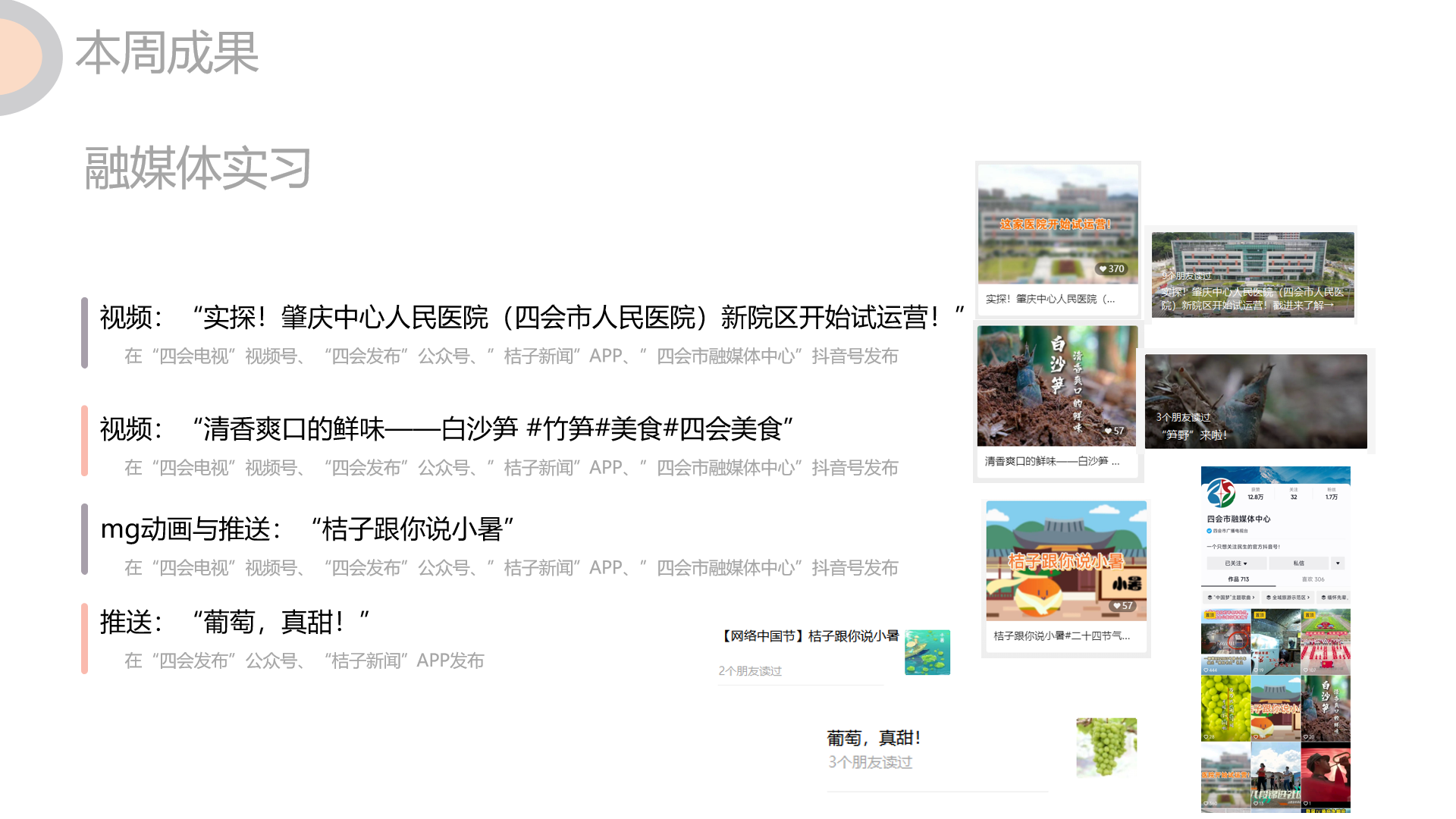 江门恩平团队在本阶段一共完成4条推文,3个已发布视频,共7条视频,3次新闻采编任务,他们还将继续寻求新的宣传方式,进行IP设计与视频脚本的制作,为当地融媒体提供新的宣传思路。