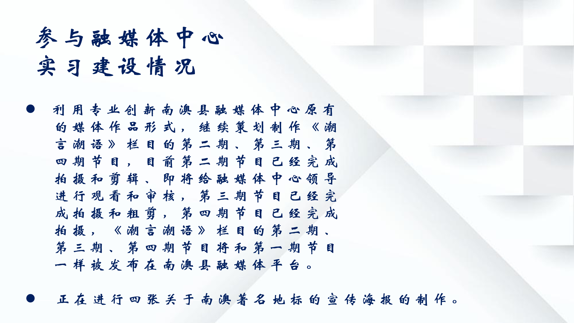 汕头南澳团队在认真完成当地融媒体中心安排的新闻任务的同时,创建制作《潮言潮语》栏目初现成果,受到一致好评,并且团队再接再厉,继续策划栏目的第二三四期,创新当地融媒体的媒体作品形式,提高融媒体作品吸引力与竞争力。