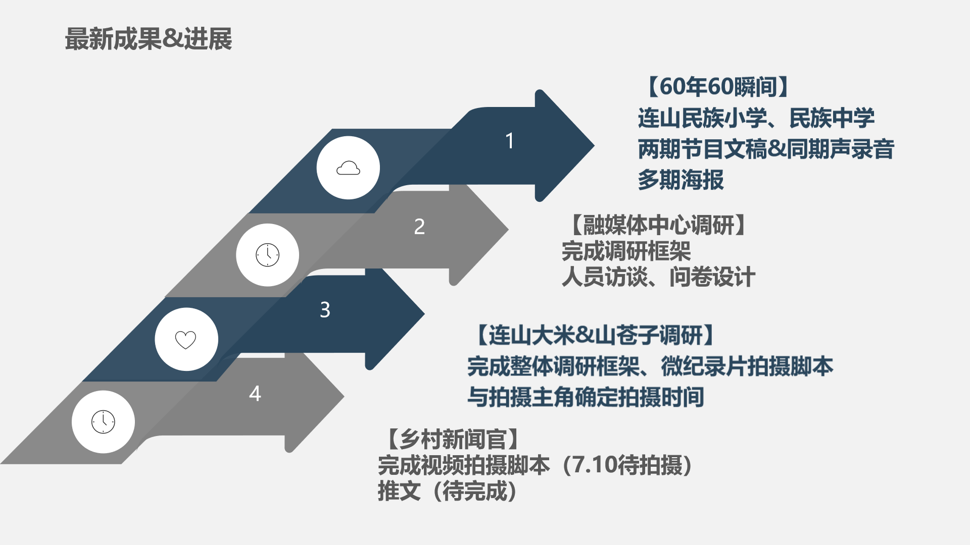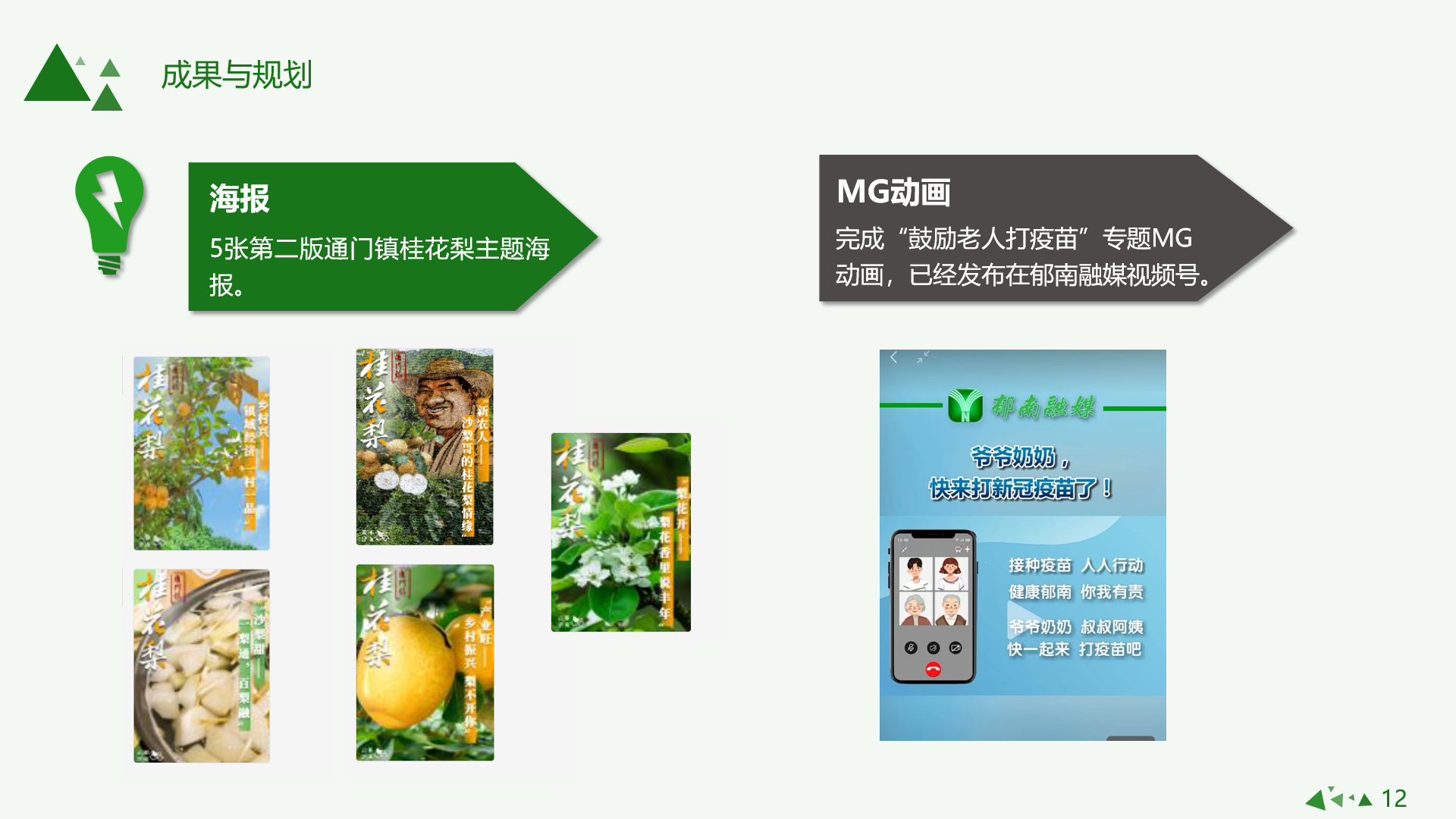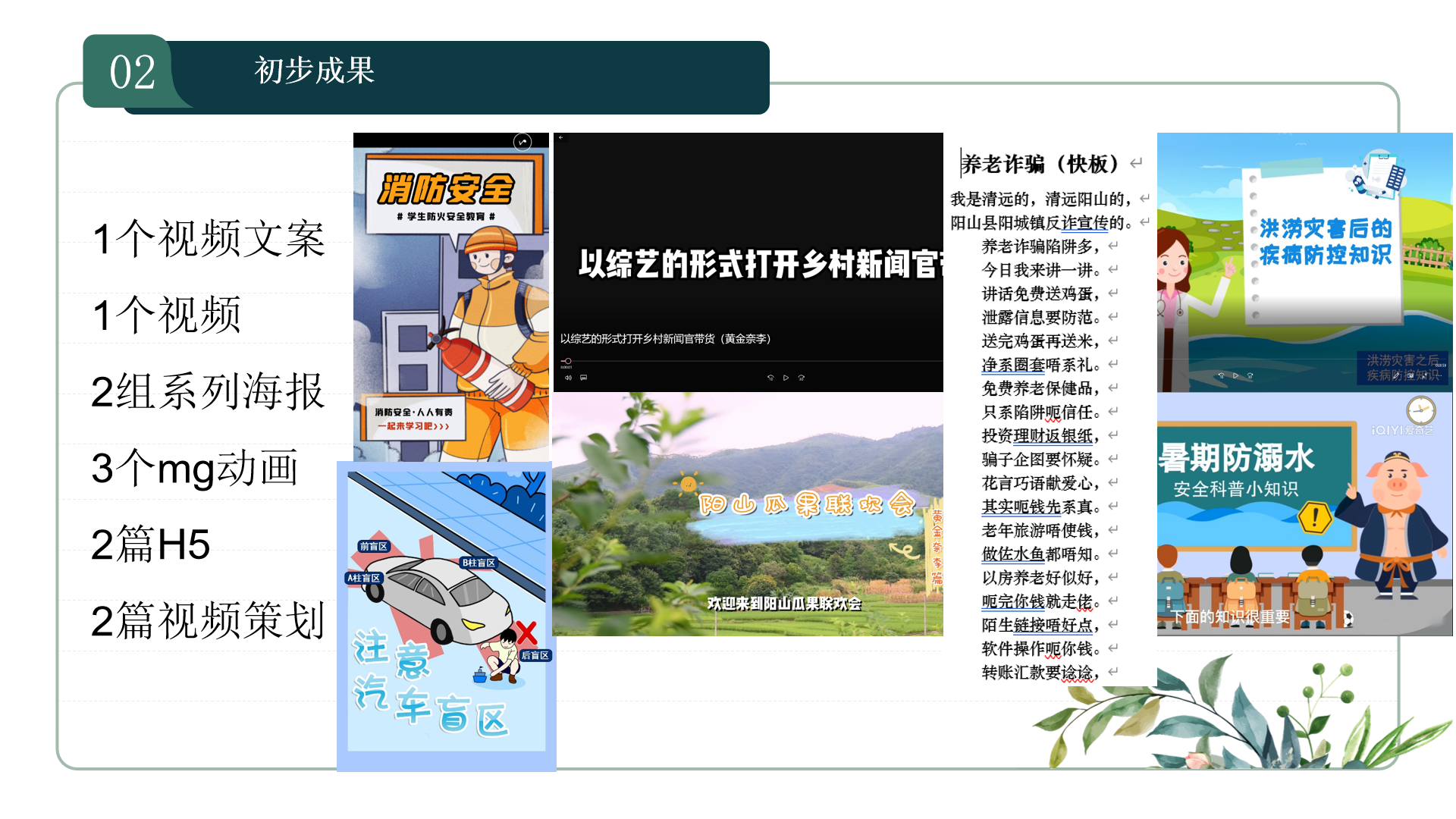 清远阳山团队充分发挥专业优势,给当地融媒体注入新鲜力量,带来许多引人入胜的新形式作品,在本阶段一共完成1个视频文案、1个视频 、2组系列海报、2篇H5、2篇视频策划、3个mg动画,助力当地社会民生、乡村振兴的宣传工作。