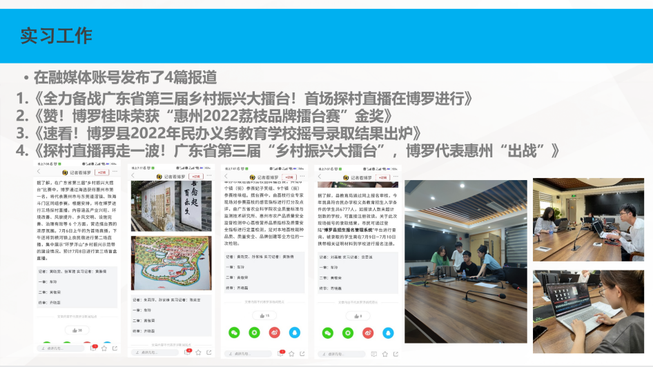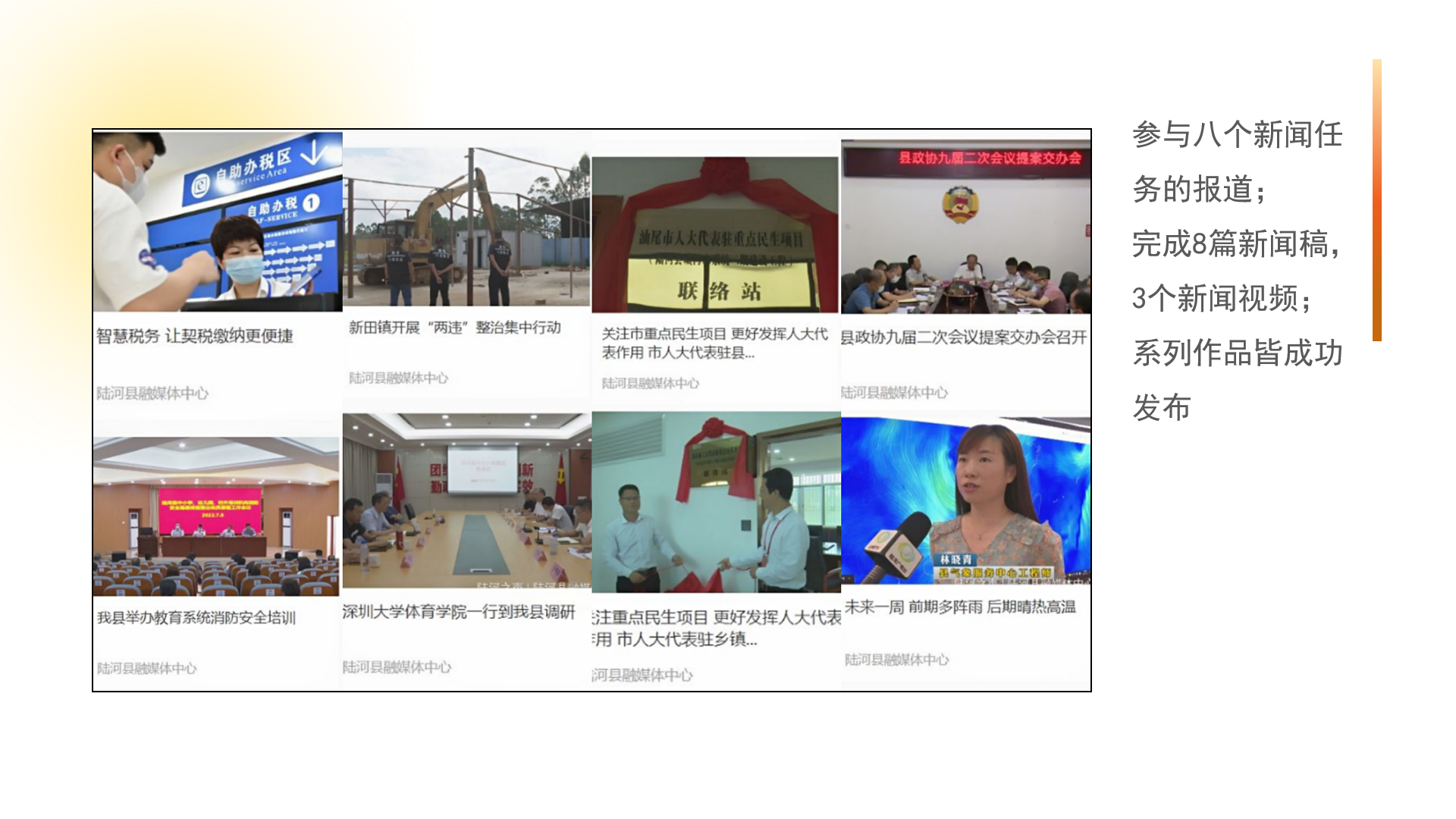 汕尾陆河团队提高在当地融媒体工作的参与度,团队作品产出效率质量得到提高,在本阶段参与八个新闻任务的报道,完成8篇新闻稿,3个新闻视频。