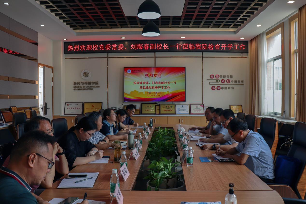 本网讯 8月29日上午,我校党委常委、副校长刘海春带领校党委宣传部、统战部、教师工作部副部长(主持工作)申明浩、后勤处副处长余泽浩、机关党委组织员杨雄辉莅临我院参加开学工作检查会。我院院长侯迎忠、院党委书记郝建萍、副院长朱颖、副院长罗坤瑾、院党委副书记黄石胜、广州城市舆情治理与国际形象传播研究中心副主任刘超、学院办公室主任吴胜出席本次会议。