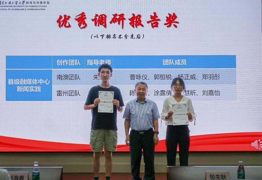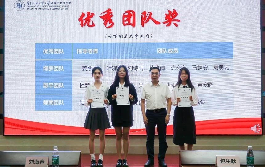 11月17日下午,新闻与传播学院以线上线下相结合的方式,举行第六届“讲好广东故事”新闻调查大赛暨县级融媒体中心新闻实践活动颁奖典礼,向取得出色成果的师生团队予以隆重嘉奖,向支持大赛举办的省委宣传部、学校党委等校内外单位表达诚挚谢意。校党委常委、副校长刘海春教授出席典礼并致辞。典礼由新闻与传播学院党委书记包生耿主持。
