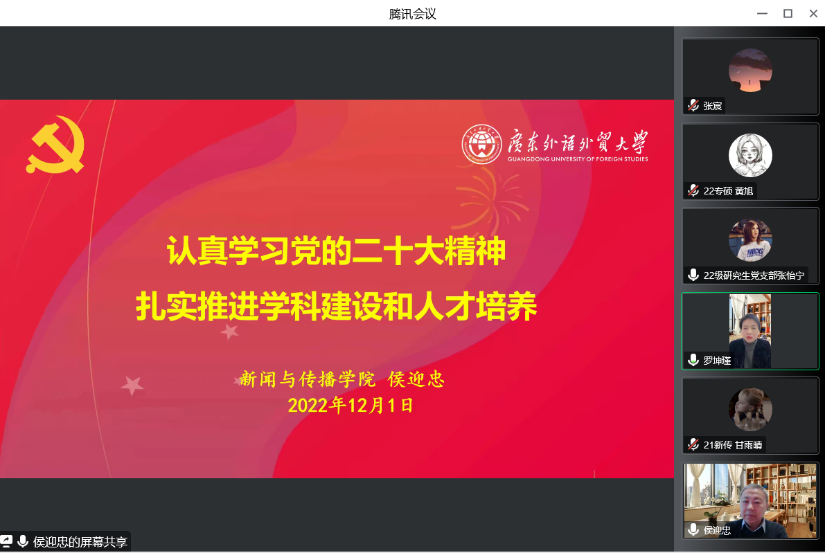 新闻学院院长侯迎忠教授作《认真学习党的二十大精神,扎实推进学科建设和人才培养》主题宣讲。本场宣讲由学院副院长罗坤瑾教授主持。侯迎忠教授从理论和工作两个层面切入,带领与会人员仔细体悟党的二十大报告内涵,深入学习党的二十大精神。侯迎忠院长指出,要扎实推进学科建设与人才培养,建设立足广东、面向世界的全媒体国际传播教学科研平台,培养立足湾区、放眼世界的国际化新闻传播人才。最后,侯迎忠院长强调,全院师生要认真学习贯彻党的二十大精神,高举中国特色社会主义伟大旗帜,在新征程中接续奋斗,切实推动学院各项工作高质量发展。