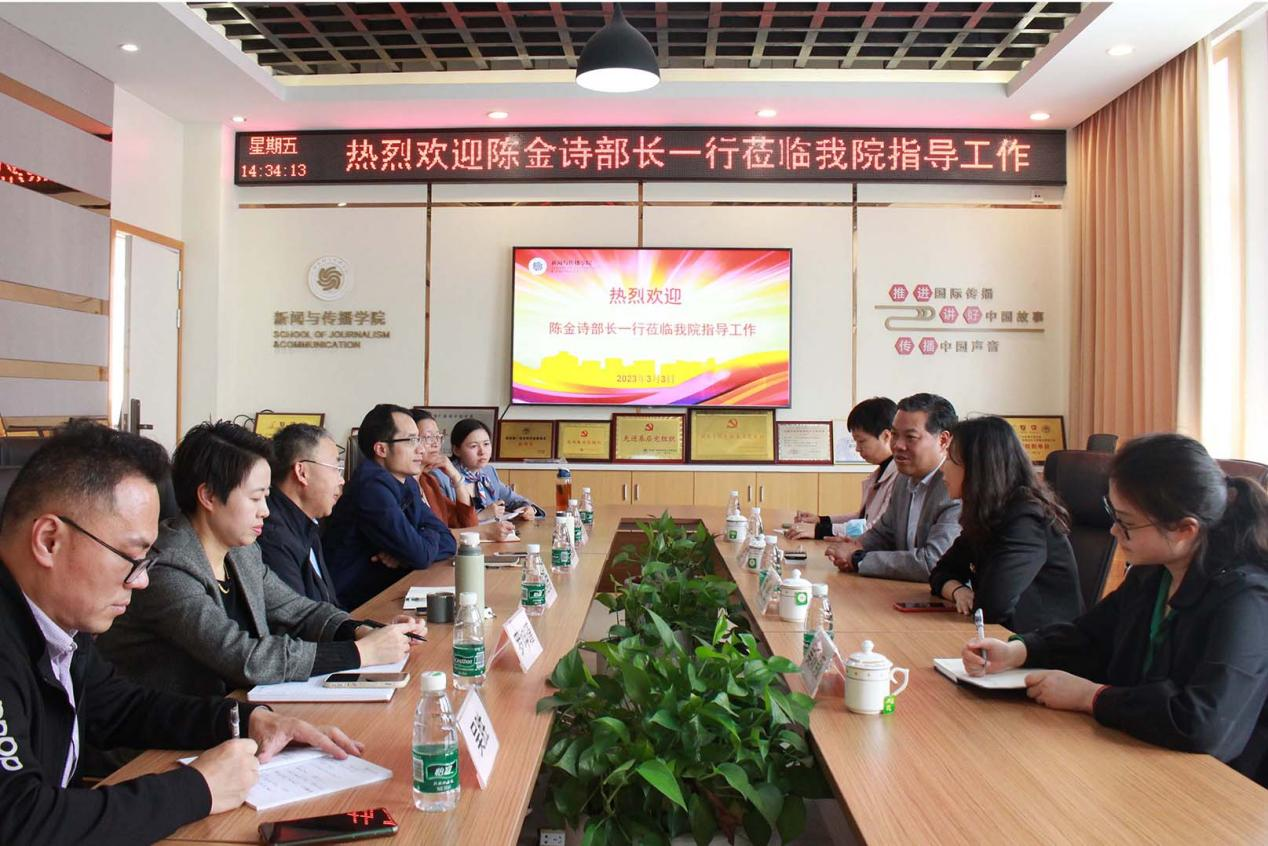 在听完汇报之后,陈金诗表示新闻学院在教育教学方面实现了许多突破,并且学院三个专业中有两个国家级专业,这样的学科建设“真的太不容易了”。他还对部校共建、学院招生工作方面提出表扬。同时,他表示学院接下来在教材方面应加大投入,指出数字化教材是一种新方向,并鼓励关注数字化教材。而在党建方面,他认为各支部也要继续交流。在指导过程中,陈金诗还回想起曾经给我院播主专业同学上过课,称赞播主专业的同学形象良好、班级氛围活泼,希望播主专业的学生可以出现在校宣传介绍视频中。