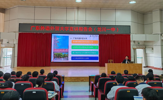 招生宣讲会在龙川一中至善厅举行,近200名学生首先观看了广东外语外贸大学宣传视频,对广外的发展历程、国际化办学特色等学校概况有了初步认识和了解。