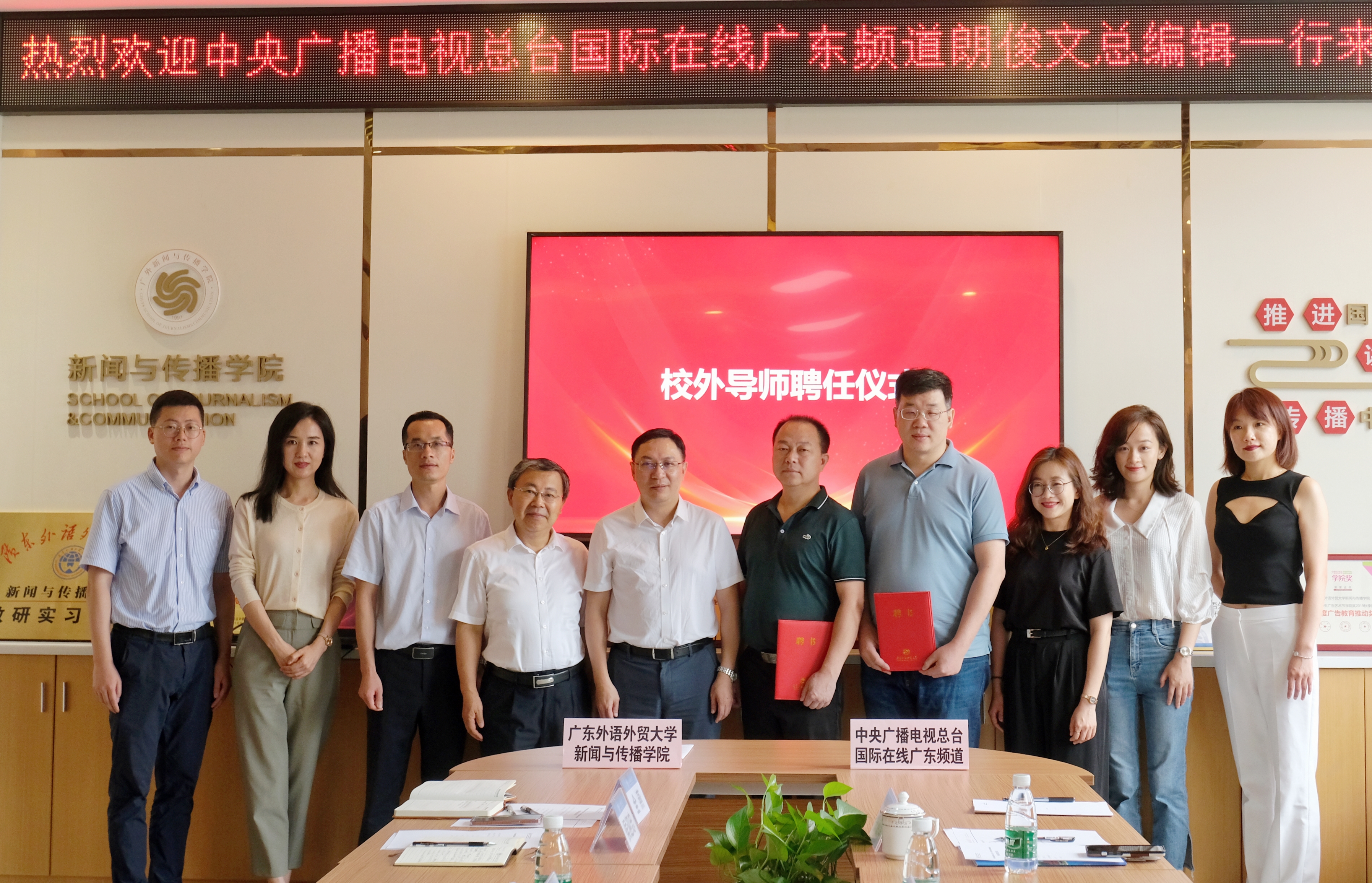 在与会领导、嘉宾的共同见证下,侯迎忠、郎俊文分别代表广东外语外贸大学新闻与传播学院与中央广播电视总台国际在线广东频道签署了合作协议。