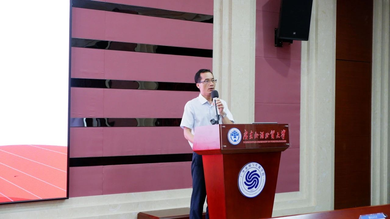 接下来,我院硕士生导师、云山青年学者姬广绪副教授作为教师代表面向全体本科新生进行发言。在发言中,姬老师表示广外新闻学院的学科发展与国家战略发展密切相关,而我院老师参与了新媒体国际传播与社会治理、湾区国际传播研究等等学科项目,此类项目都与国家包括大湾区发展有着紧密联系。因此,姬老师认为我们的新生需要具备一种家国情怀,秉持对家庭的关爱和对国家的热爱,同时也积极地为社会做出贡献,成为一个有情感、有责任感的优秀青年。