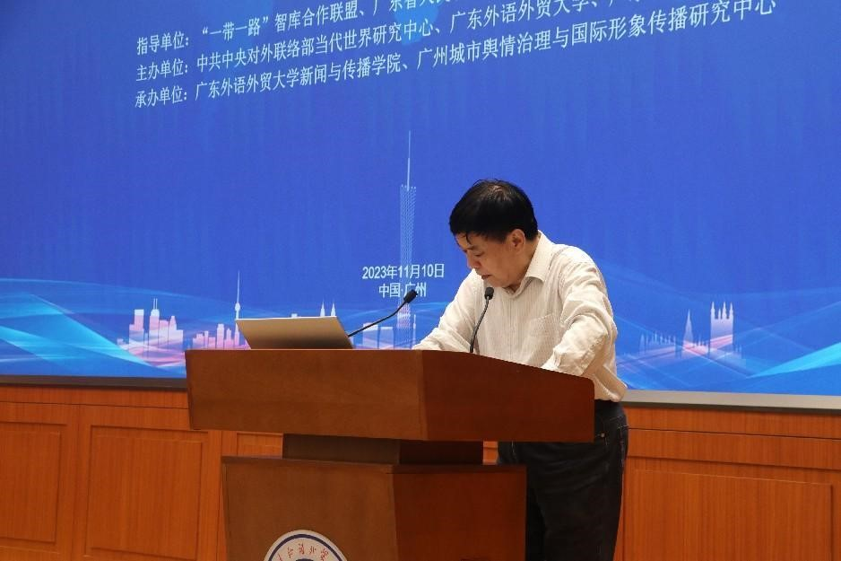 11月10日下午,由广东外语外贸大学新闻与传播学院和广州城市舆情治理与国际形象传播研究中心共同承办的21 世纪海上丝绸之路国际智库论坛(2023)平行论坛“构建海洋命运共同体暨湾区国际传播”在广东外语外贸大学白云山校区举行。来自中国人民大学、中国传媒大学、中国社会科学院新闻与传播研究所、武汉大学、北京师范大学、暨南大学、重庆大学、北京外国语大学、大连外国语大学和广东外语外贸大学等高校的专家学者,围绕“一带一路”倡议与国家形象、国际传播的价值基础,海洋命运共同体的理念、传播与影响,湾区形象塑造与国际传播等议题展开深入研讨。论坛由广东外语外贸大学新闻与传播学院院长侯迎忠教授和副院长罗坤瑾教授共同主持。