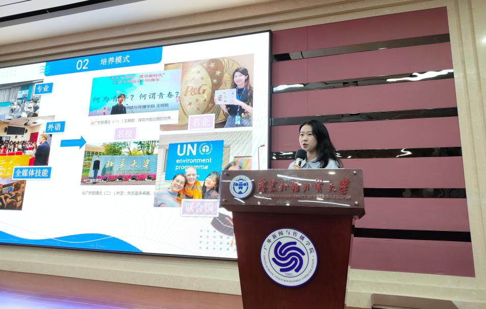 广外新闻学院21级本科生罗怡彤分享了在广外的学习和生活感受以及个人成长经历。她表示广外具有丰富的学习资源和实习实践平台,在广外国际化特色“外语+专业”的培养模式下,专业能力以及国际化素质得到全面提升。