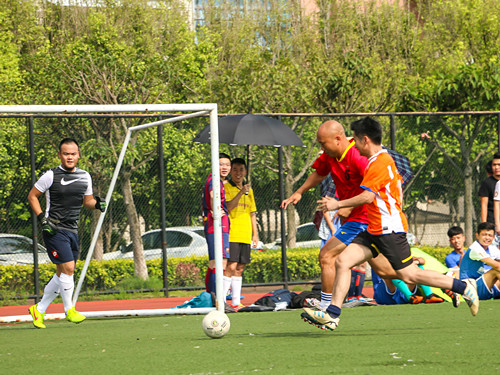 上半场的比赛先由教职工对阵校友,刚开始的五分钟,教职工队把握住了节奏,在保持控球的基础上利用两个边路的拉扯发起进攻,很快19号便连续觅得破门良机,可惜都被校友队的门将给封堵了。尽管如此,他们的持续进攻在第八分钟得到了回报,5号在中路持球,看到禁区前沿启动的队友,瞬间送出手术刀般的直塞,而本在传球路线上的6号球员心领神会地漏过,在后点的19号轻松推射得手,教职工队一比零领先。